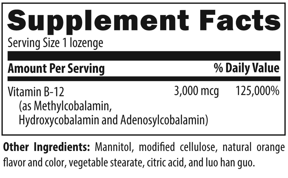 Tricobalamin™ lozenges provide a synergistic combination of the three bioavailable forms of vitamin B12, as methylcobalamin, hydroxycobalamin, and adenosylcobalamin. These three forms of B12 are naturally present in foods and can be readily converted in the body to the active intracellular forms of B12. Tricobalamin™ lozenges are formulated to support healthy levels of vitamin B12, with their lozenge delivery system allowing for optimal absorption of B12.
